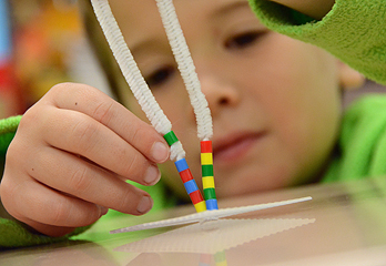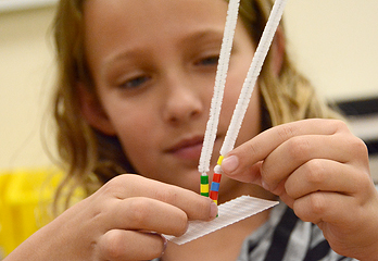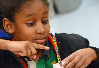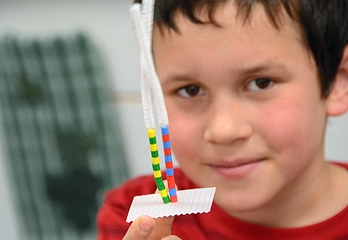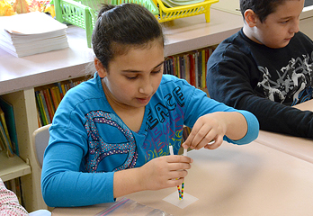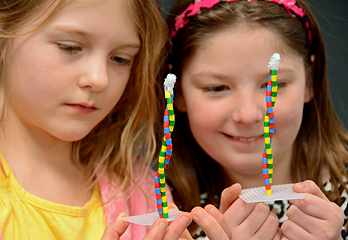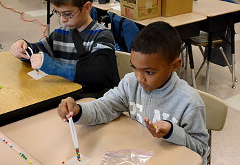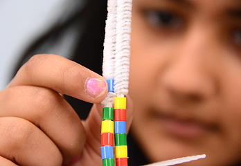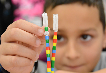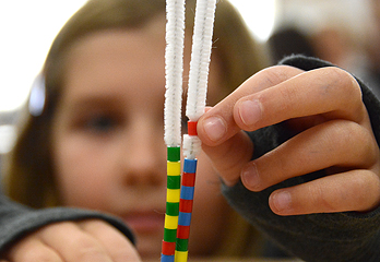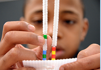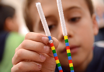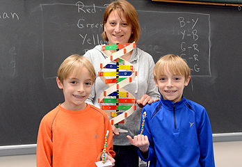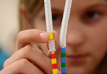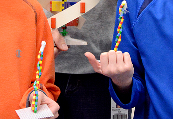 Dr. DeLeo helped us to understand all of this by giving us beads in fours colors, representing A, T, C, and G. We used a pipe cleaner to put together our make believe DNA. Here are pictures of us putting together our DNA models. We can place any of the four colors in any order along one of the strands. However, where ever there is a blue bead on one side, we must have a yellow bead on the other. And, where ever there is a red bead on one side, we must have a green bead on the other. When we were done, we twisted the strands gently to give it the shape of a helix. We placed an extra twist at the top to hold in the beads, and then bent the sharp end of the pipe cleaner so we wouldn't get poked.