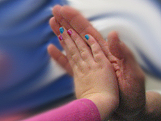 Dr. DeLeo told us that our blanket of air pushes on us; it exerts a force on us (and everything) of about 15 pounds on every one-inch square. That's like the weight of 3 bags of sugar pushing on each square inch of our body! We don't get crushed because there is an equal force pushing from the inside out as well. Remembering that a force is a push or a pull, we demonstrated how two forces can be in balance, like in the photo on the left. However, if one hand, say the left hand, pushes harder, both hands - and anything in between - will move to the right.