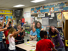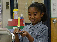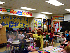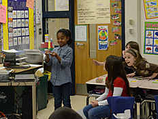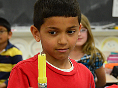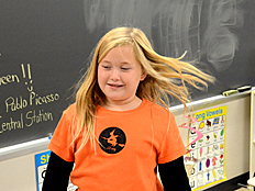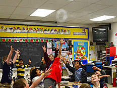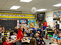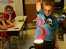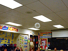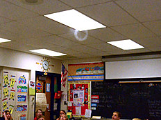 Since Weather is one of the science units we are studying this year, we talked next about what happens when air is heated up. Many of us already knew that hot air rises, and cooler air falls. Weather patterns on Earth are driven by this effect as the sun heats the Earth's surface and the air above it. Dr. DeLeo demonstrated that hot air rises by placing a spiral piece of paper above a hot light bulb. The rising hot air pushed on the paper and made it spin. |