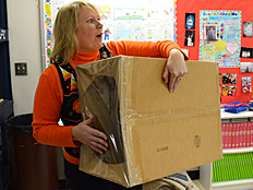 For our final adventure, Dr. DeLeo brought in a box with a large hole in one end, and a smaller hole in the other. The large hole was covered with a clear plastic shower-curtain liner. When you wacked the plastic with your hand, a ring of air, called a ring vortex, came out the other end. You can see it blowing students' hair in the photos below. |