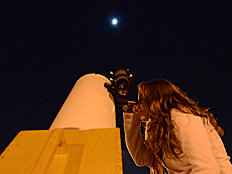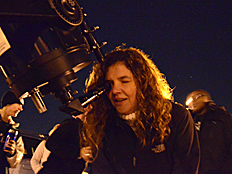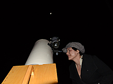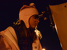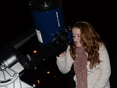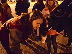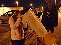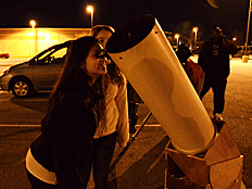 | Mrs. Weidenhammer was the first to look through the SCT telescope when aimed at the moon. Perhaps she wanted to make sure looking through the telescope was safe before allowing students to look. The telescope on the far right is a Newtonian reflector. |