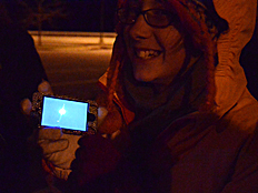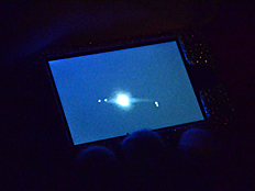 | The four larger moons of Jupiter, first observed by Galileo and called the Galilean satellites, were easily seen through the telescope. Students discovered they could photograph the moon and Jupiter using their phones. One student even got a photo of Jupiter's moons. Jupiter, itself, is overexposed in the center of the photo, while the moons are easily seen, two on each side. |