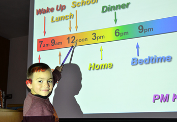 In order to make sure that we really understood the timeline, Dr. DeLeo asked us to point to places on the timeline that were not labeled. For example, he asked us to point to where we would brush our teeth before going to bed. We knew that we should point to a spot just before bedtime, and not after we went to bed. Nobody brushes their teeth while they are in bed sleeping! Here are photos of us pointing to different times on the timeline.