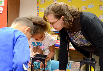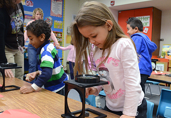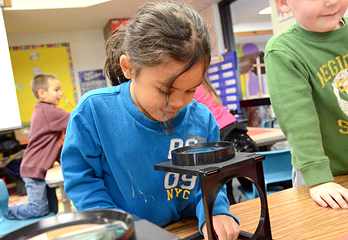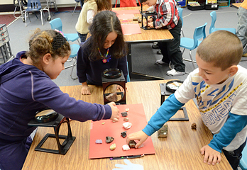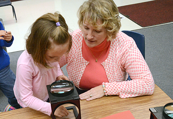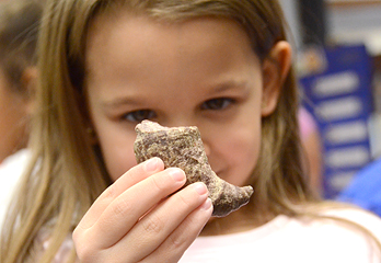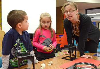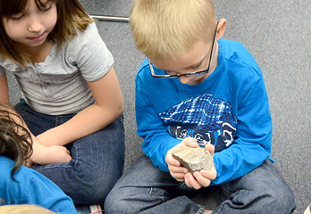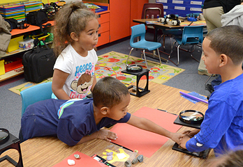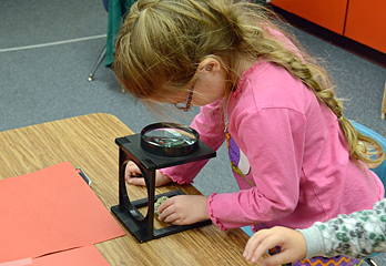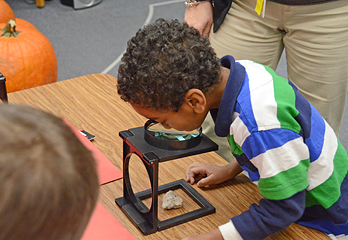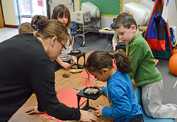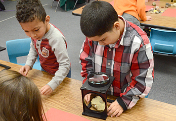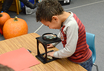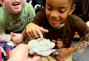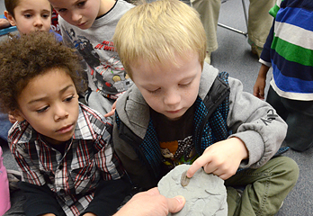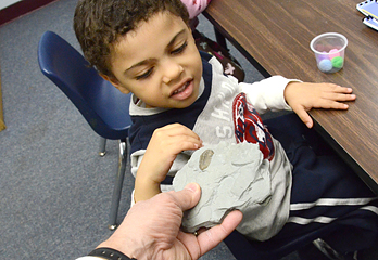 Dr. DeLeo set up special magnifying glasses in the room. They make things look real big when you look through them. Dr. DeLeo tried to scare us by looking at us through one of the magnifiers, but we don't scare that easily! We used the magnifiers to look at the fossils, rocks, and animals bones that Dr. DeLeo brought in. When plants and animals that lived a long time ago die, they sometimes become hard like rock. These are called fossils. Below are some pictures of us looking at fossils, rocks, bones, and other things in the classroom.