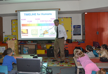 Dr. DeLeo used a computer and a projector in our classroom, and he even showed movies! We asked a lot of questions! He began the computer slide show by describing "timelines" to us. A timeline is like a clock, only instead of a circle, it is a line. He reminded us that a line that goes from left to right is called a "horizontal" line!